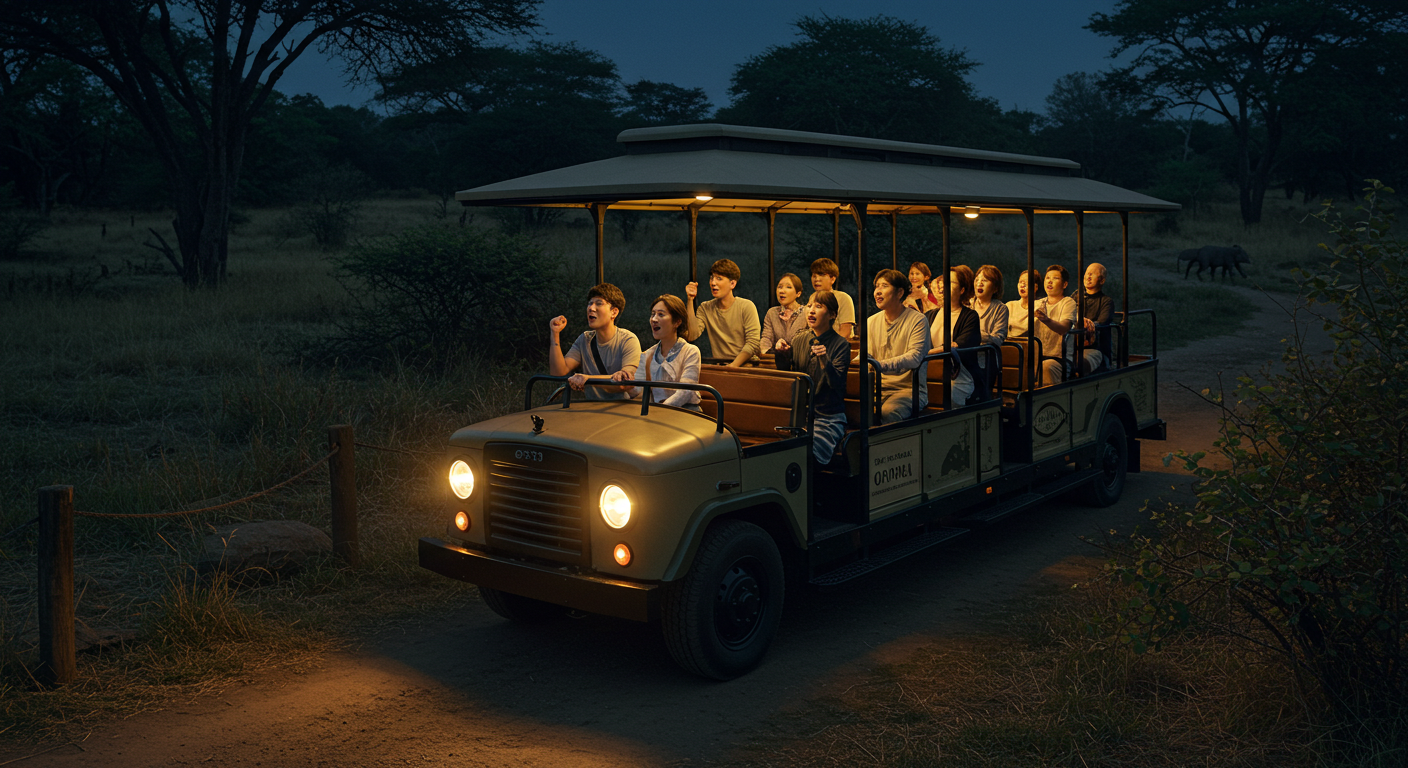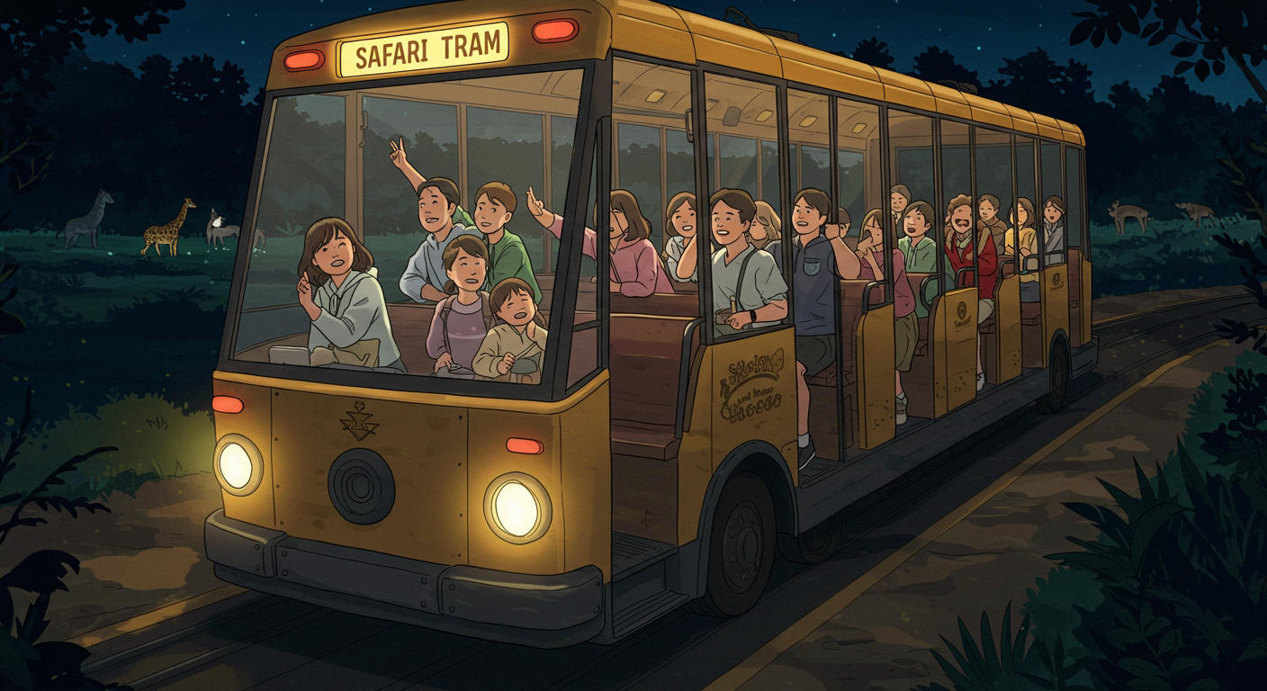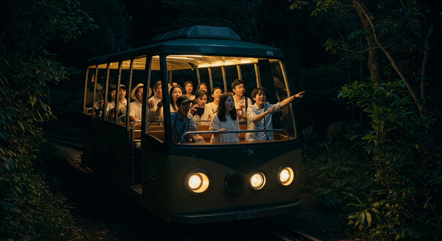 아래 이미지는 이해를 돕기위해 AI로 생성한 이미지입니다. 실제 운영되는 나이트 사파리 트램과는 무관합니다.