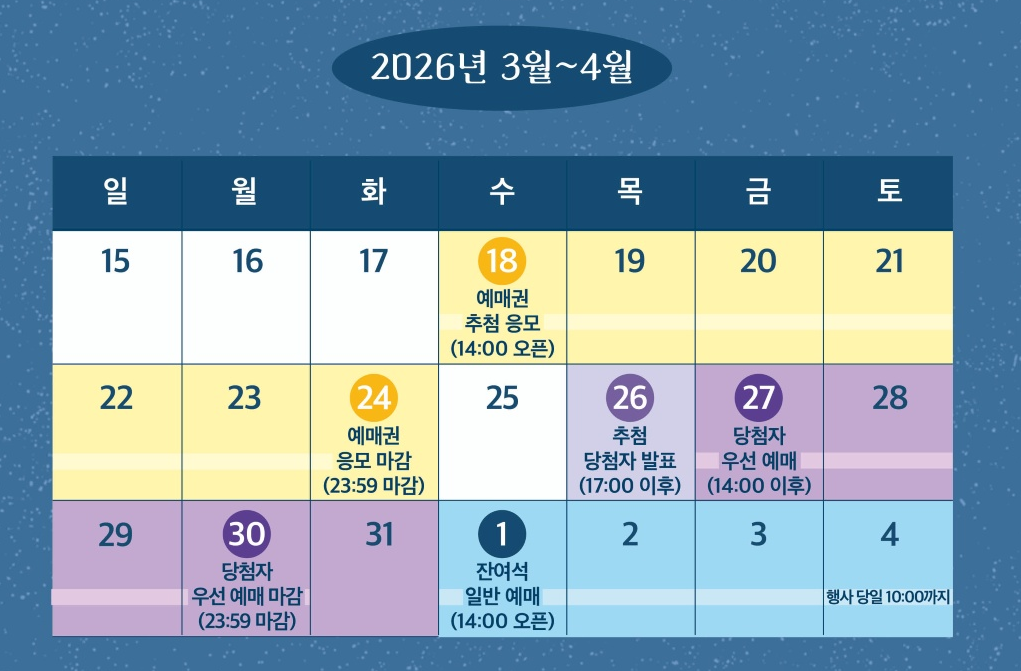 - 대상: 추첨 탈락자 및 미예매자 (취소분 발생 시 진행)
